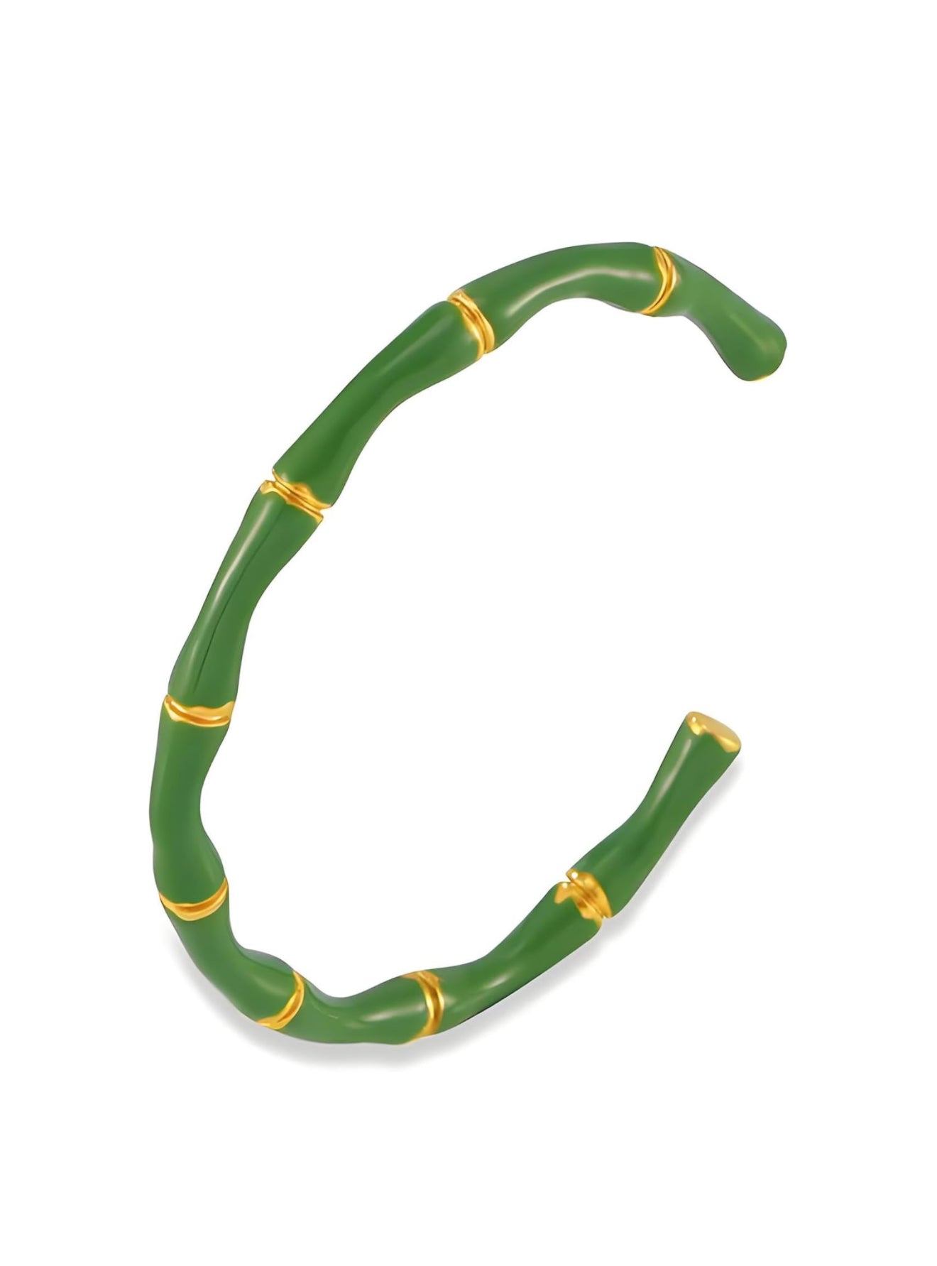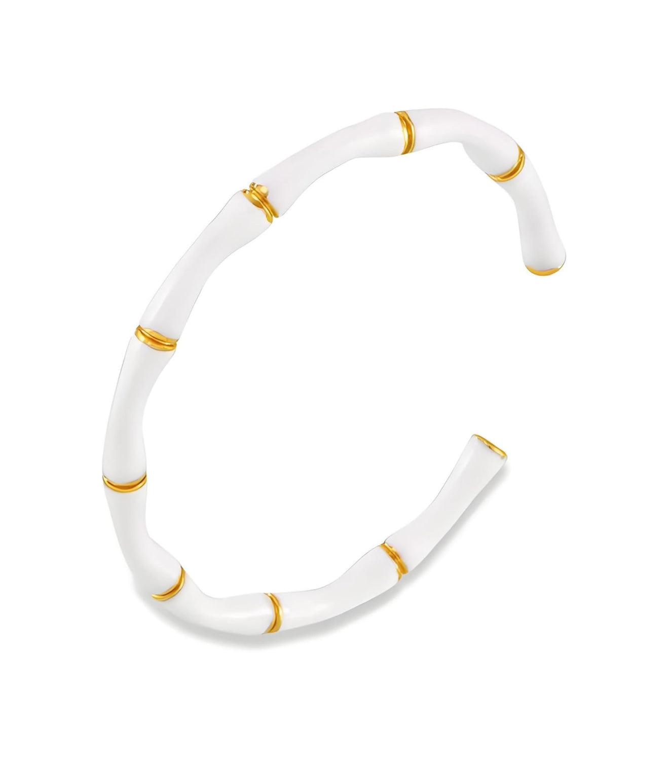Bring a touch of effortless island elegance to your everyday stack with the Bamboo Cuff Bracelet. Designed with a sculpted bamboo silhouette and accented in luminous 18K gold plating, this enamel cuff adds the perfect pop of resort-luxe color.