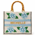 Inspired by Cape Cod summers, seaside gardens, and classic coastal style, this stunning tote features hydrangea detailing, beautiful bamboo handles, and custom gold lettering of your choice.