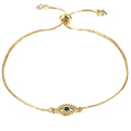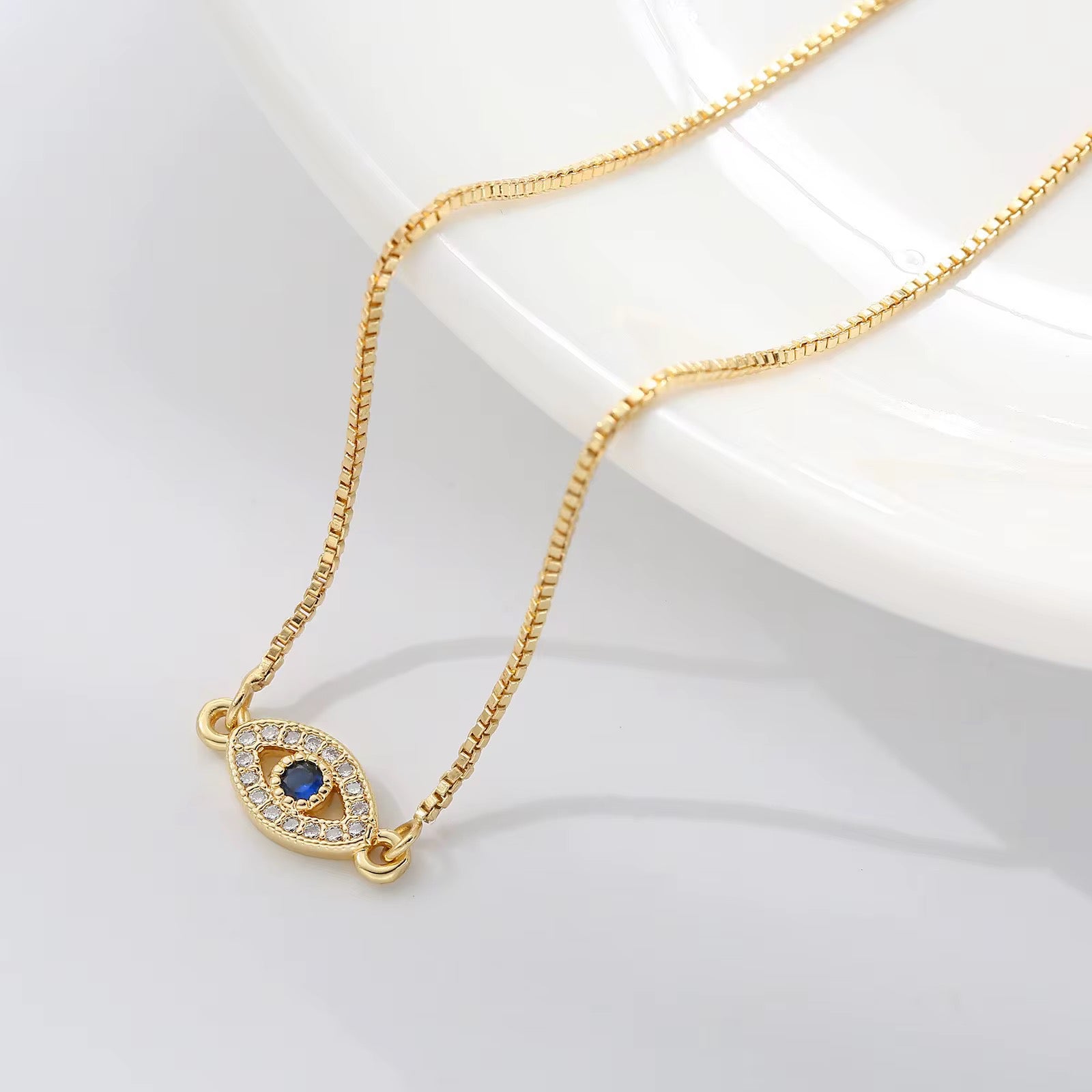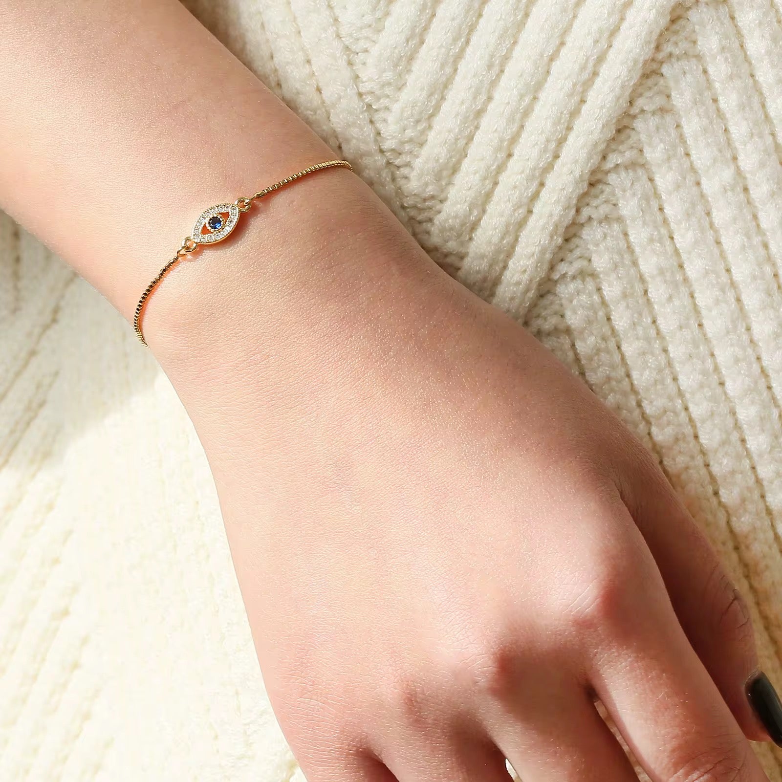 Keep protection and style close at hand with our Midnight Guardian Bracelet. Featuring a sparkling sapphire-blue evil eye at its center, this adjustable slider bracelet is plated in 18-K gold for a radiant, lasting finish. The delicate box chain is accented with shimmering details, making it as chic as it is symbolic.