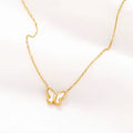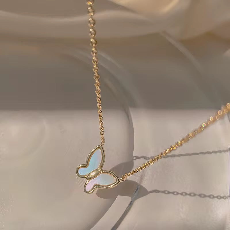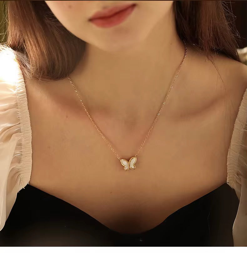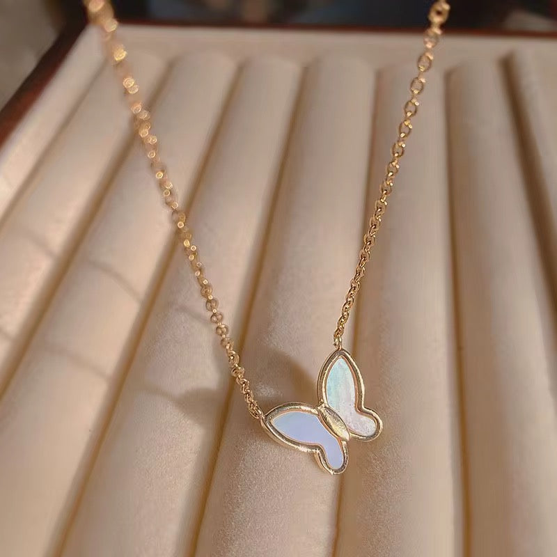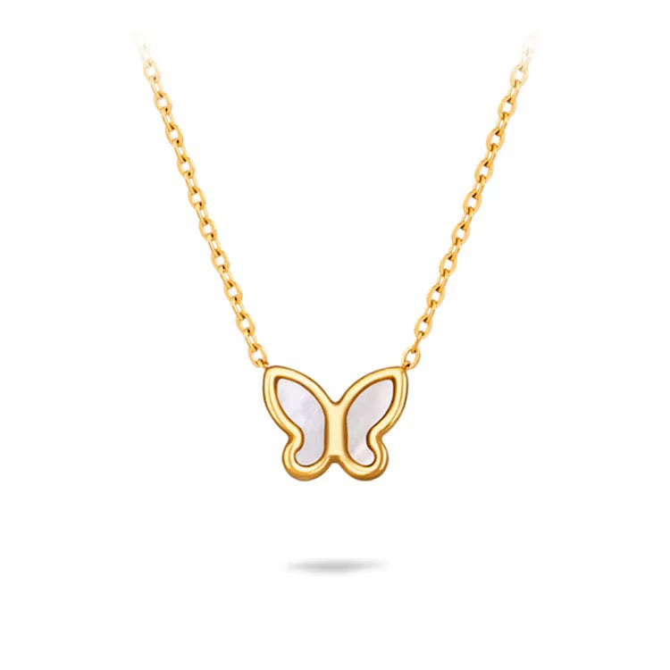 Delicate and timeless, the Adeline Butterfly Necklace features a beautifully crafted butterfly pendant in luminous mother-of-pearl, set in 18k gold-plated detail. This dainty piece is designed to add a touch of elegance to your everyday style or elevate a special occasion look. The adjustable chain allows for versatile layering or solo wear.
