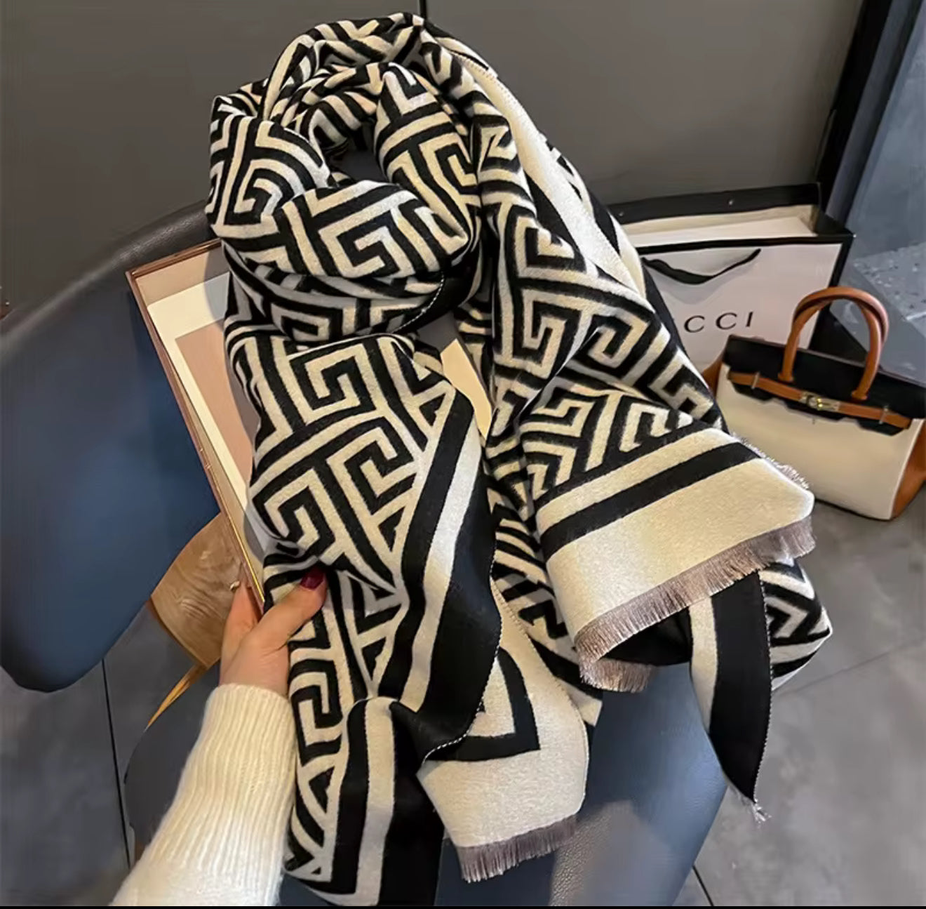 Elevate your everyday style with the Athena Scarf. Woven from a soft cashmere blend, this oversized wrap combines cozy comfort with timeless sophistication. Its bold geometric pattern makes it the perfect accessory to layer for travel, work, or a chic night out.