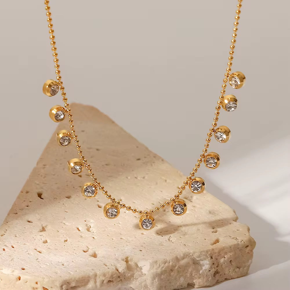 The Rachel Dainty CZ Necklace is the epitome of understated elegance. Featuring a delicate beaded chain adorned with sparkling CZ diamonds, it offers a refined shimmer that complements any look. Perfect for layering or wearing solo, this necklace adds a touch of effortless sophistication.