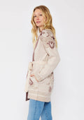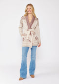 Tribal yarn pattern coatigan with a shawl collar neckline, side pockets, and a belt, blending the structured comfort of a coat with the relaxed ease of a cardigan.